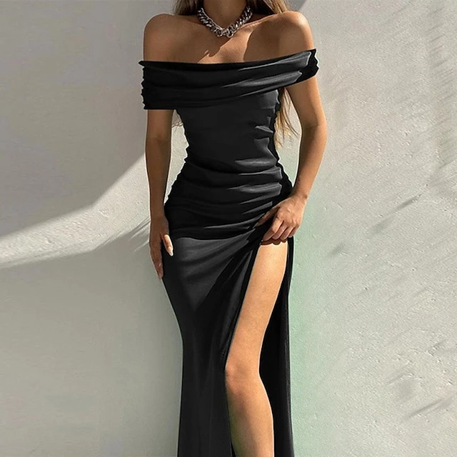 – Off the shoulder and short sleeve design, along with the backless feature, add a touch of sultriness to the dress