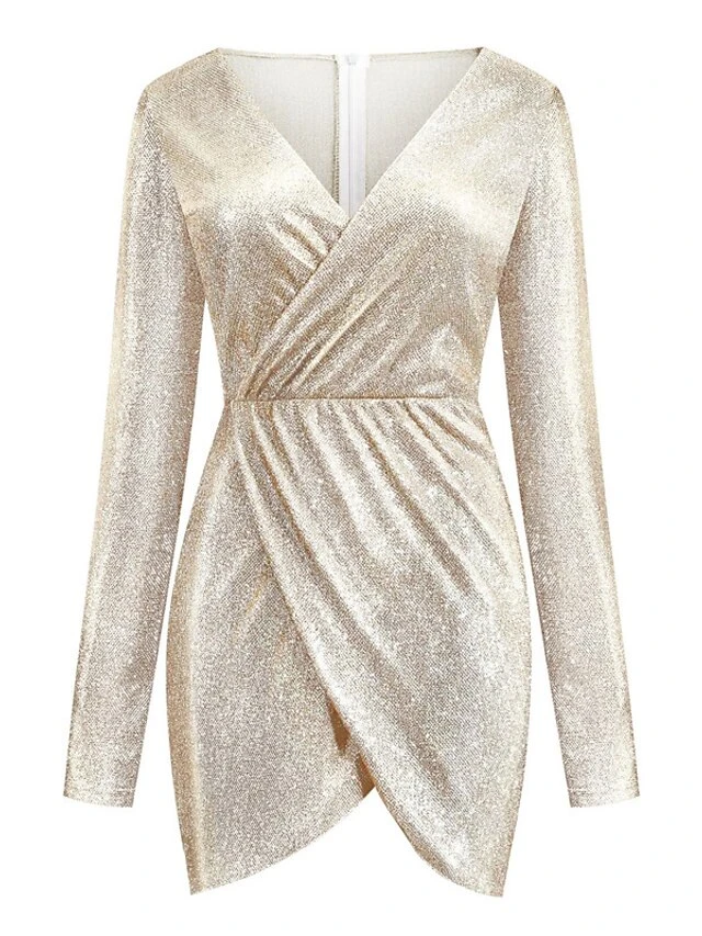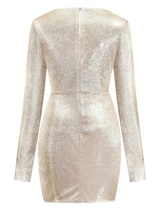 4. Deep V-Neck and Long Sleeve: The dress showcases a deep V-neckline and long sleeves, creating a stylish and elegant look.
